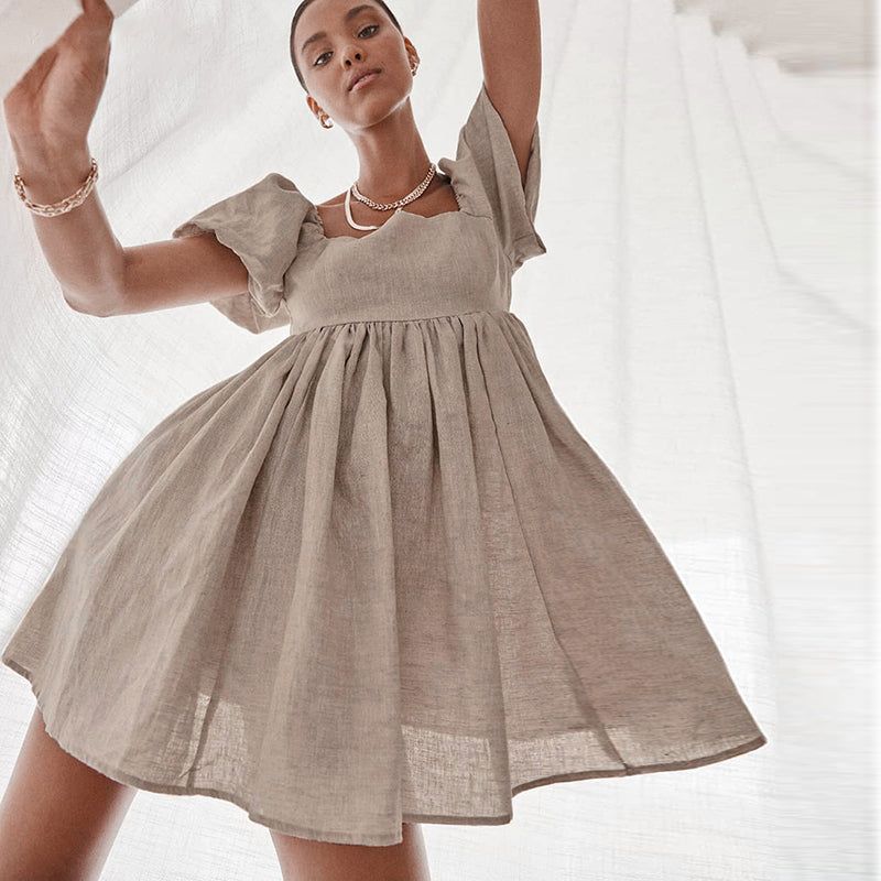 This A-line dress is made from lightweight cotton and linen. It features a square collar and puff sleeves. Plus. the solid beige hue will go with everything in your closet.